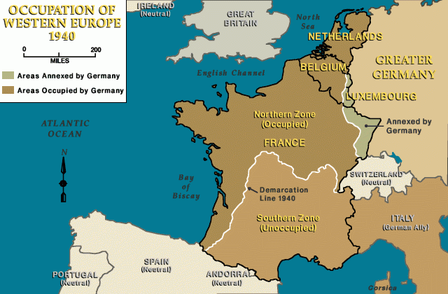 Nazi occupation of western Europe in 1940. The southern, unoccupied zone of France was controlled by the Vichy regime.
