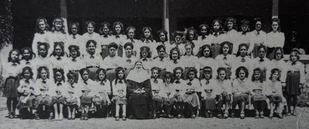 Barbara: La escuela era... era realmente una escuela maravillosa. Las monjas eran cálidas, cariñosas, atentas, bien educadas. Mi hermana y yo tuvimos una maravillosa, maravillosa educación en la escuela. Jugábamos a juegos increíbles en la escuela. Había una... había una maravillosa estatua de la Virgen María en el patio. Y ahí jugábamos a la mancha, y la Virgen María participaba. Es decir, teníamos que tocarla para... y entonces... nos escondíamos debajo de los bancos. Y había una gruta en la... cuando entraba por primera vez a la escuela, había una hermosa, hermosa gruta. Y me paraba en la gruta porque estaba cubierta de hojas verdes y velas... y era maravillosa y hermosa.