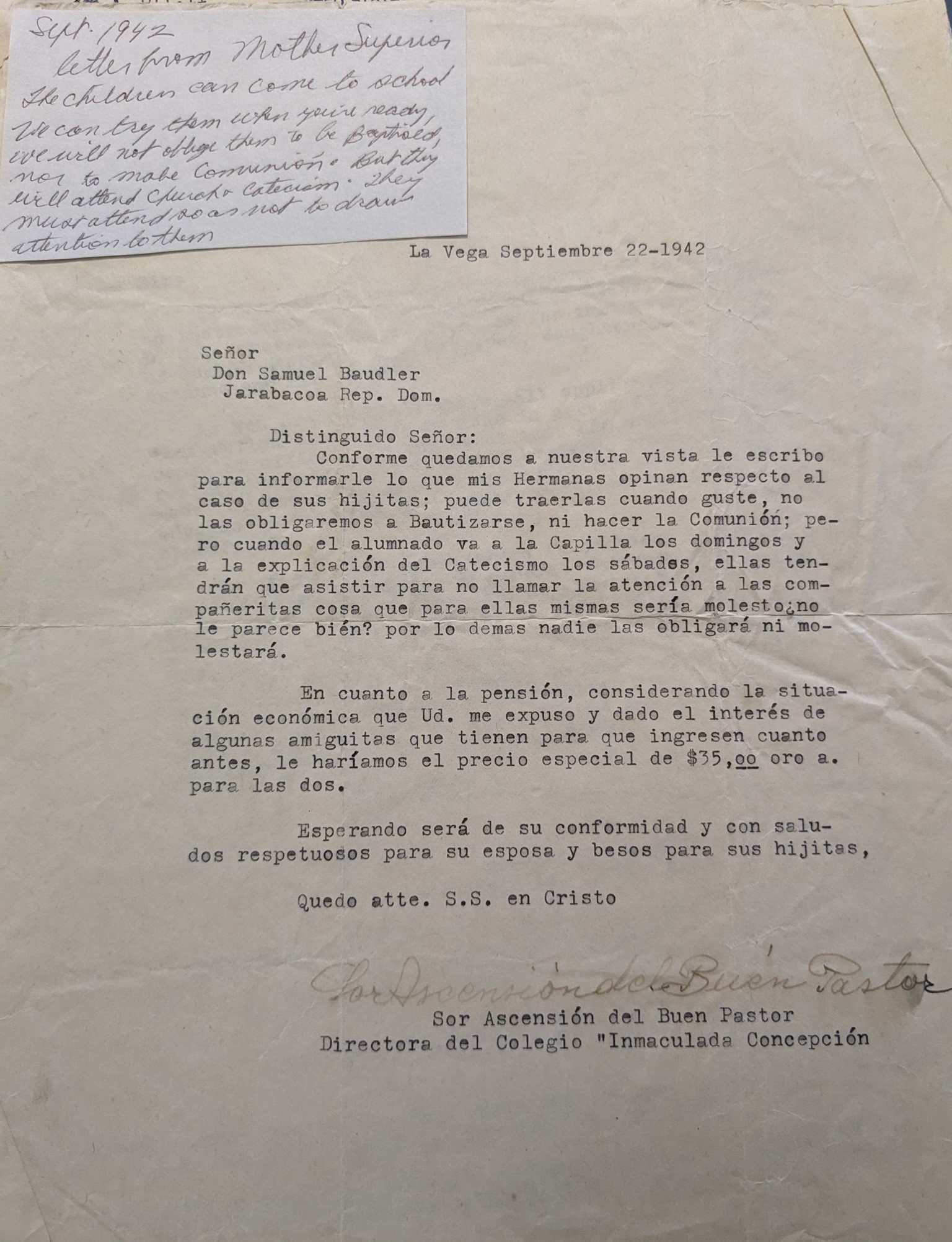 Aparte de los Bandler, el único europeo que vive en los alrededores de Jarabacoa es un sacerdote católico al que solo se refieren como «Padre». Los Bandler entablan una relación amistosa con él, y pronto les presenta a una monja, Madre Ascención, quien dirige una escuela para mujeres, el Colegio Inmaculada Concepción, en el pueblo vecino de La Vega. Madre Ascención accede a aceptar a Barbara y Ann como estudiantes del internado a condición de que ninguna de las dos niñas, ni nadie, revele que son judías. Nadie sabe de dónde vienen Barbara y Ann, ni cómo es que se encuentran en la región montañosa del interior de la República Dominicana.