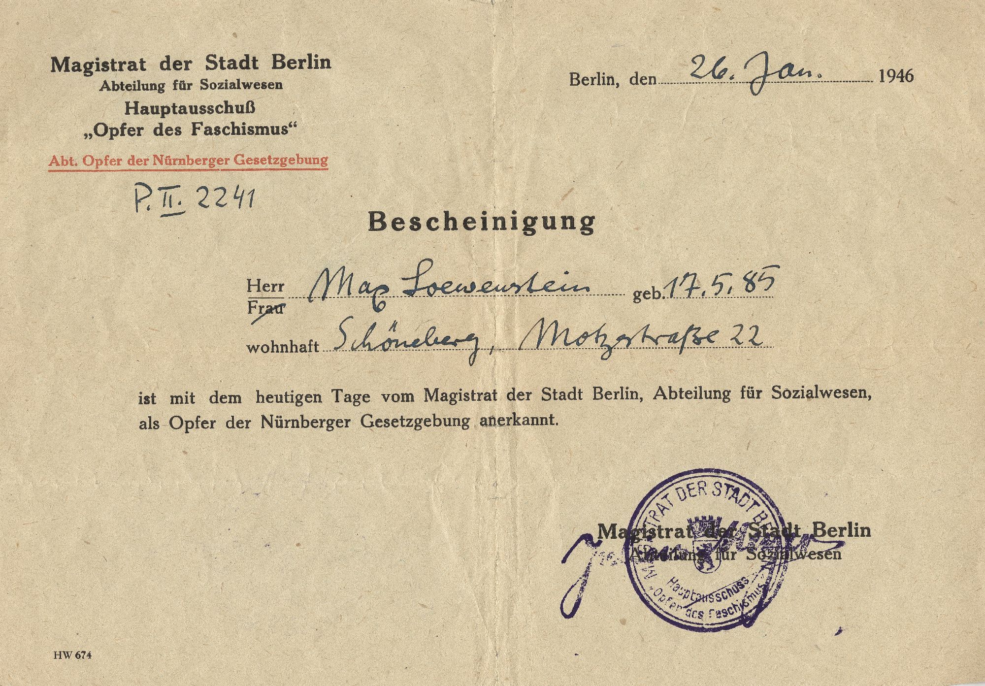 Certificate of victimization issued to Max Loewenstein on January 26, 1946 in Berlin. This document certifies that he was a victim of the Nuremberg race laws.