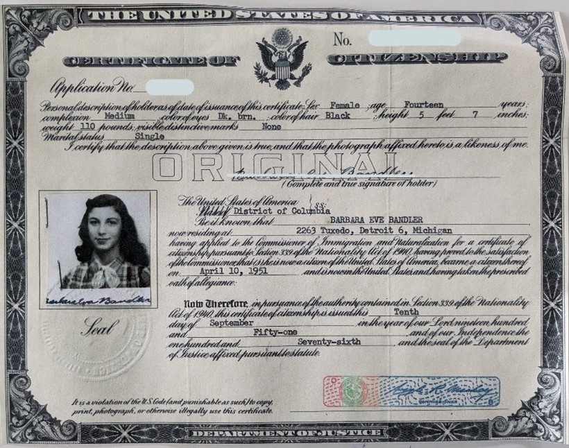 Barbara and Howard, her older crush, begin dating seriously while she is still in high school and he is at the University of Michigan in Ann Arbor. Alexander likes Howard, but his behavior towards his daughter’s boyfriend can be unpredictable. One day, Howard returns from college to visit Barbara while Alexander sits nearby reading the paper. Howard mentions that he no longer believes in God or in being Jewish. At that, Alexander jumps up, flying into a rage, takes Howard by the collar, and throws him out of the house. “My father had gone through all he had gone through because he was Jewish,” Barbara considers, “and here was Howard trying to deny [his identity], and my father just lost it.” Although the Bandlers are not religiously observant, the family always retained a profound respect for their Jewish heritage, and mourned the Jewish world that was destroyed in the Holocaust. For Barbara, the time she spent in Jewish summer camps helped her form an identity and a sense of Jewish community that has never left her.