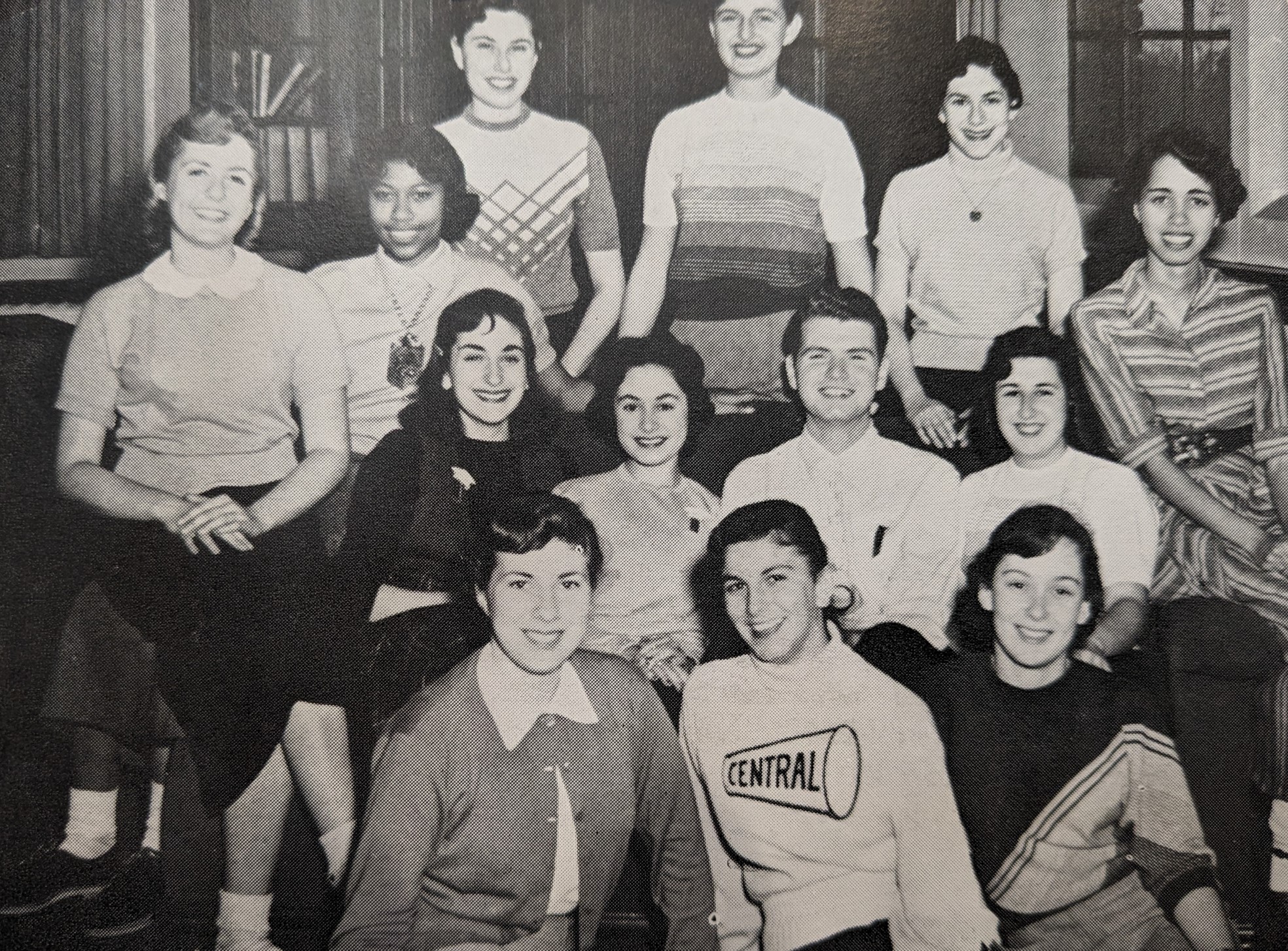 A photo from Barbara’s high school yearbook, c. 1953. Barbara is in front, wearing a Central High cheerleading sweater.