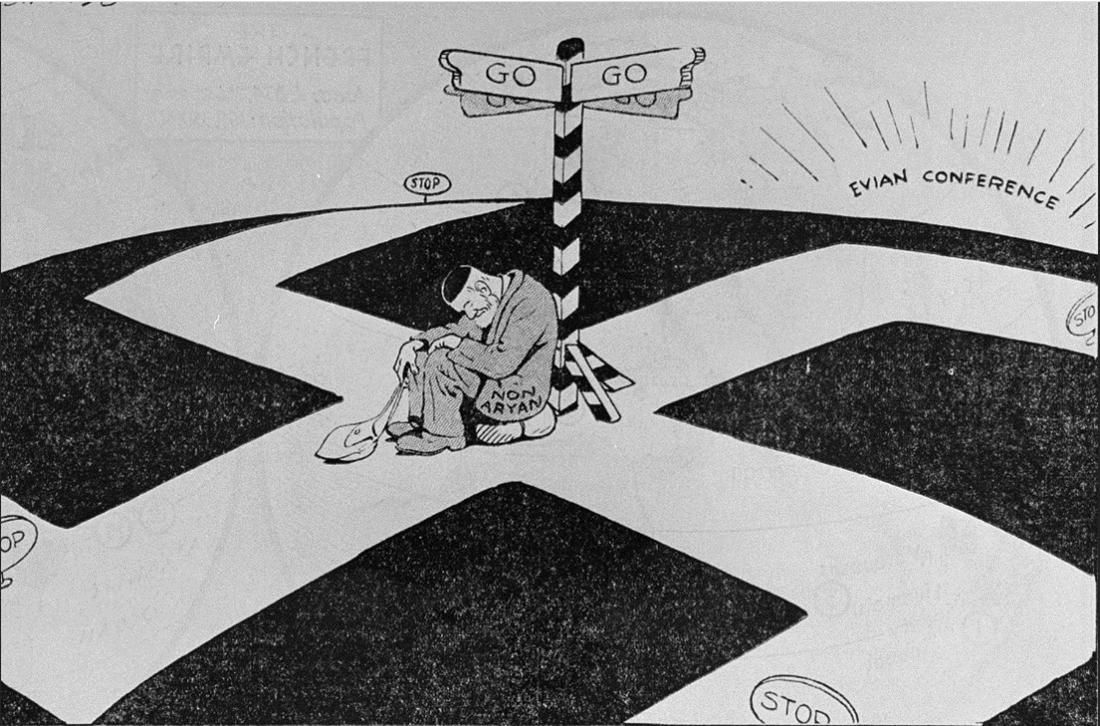 Caricatura política de Sidney 'George' Strube, titulada «¿Lo guiará la Conferencia de Evian hacia la libertad?» que se publicó en la edición del domingo 3 de julio de 1938 en el The New York Times.