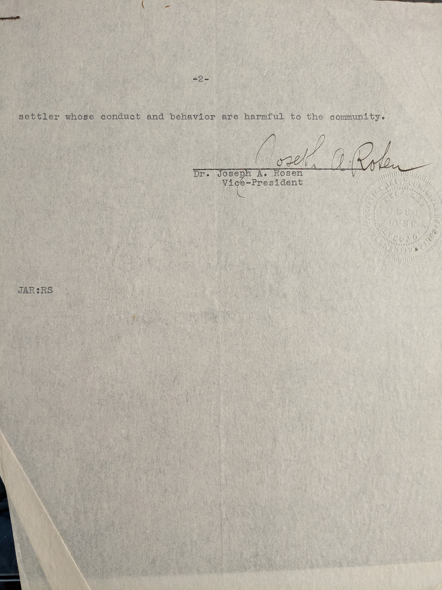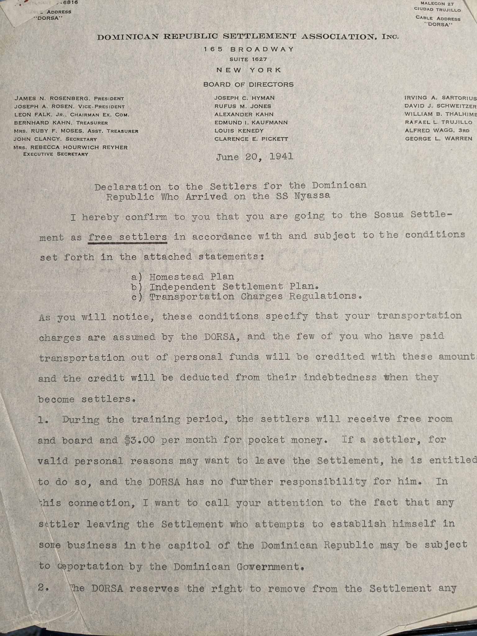 Carta de la DORSA a los refugiados judíos aprobados para inmigrar a la República Dominicana en la que se explican las condiciones del reasentamiento. 20 de junio de 1941.