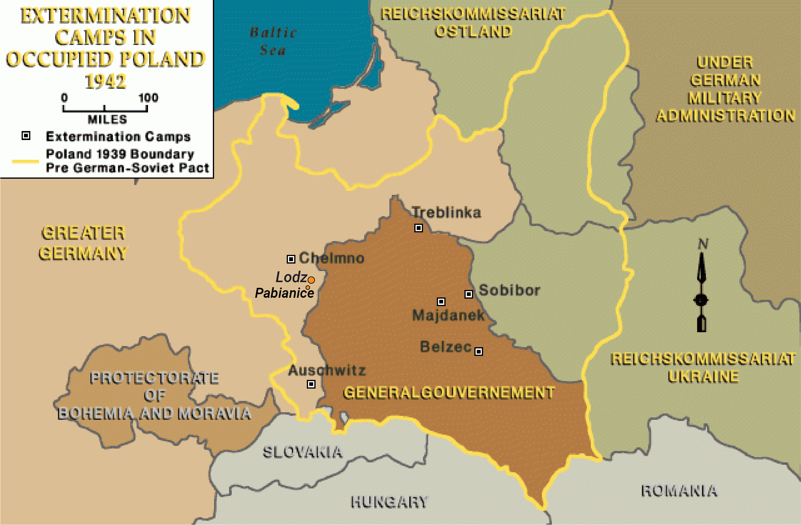Killing Centers in Occupied Poland, 1942: Auschwitz, Belzec, Chelmno, Majdanek, Sobibor, Treblinka. Lodz and Pabianice are indicated.