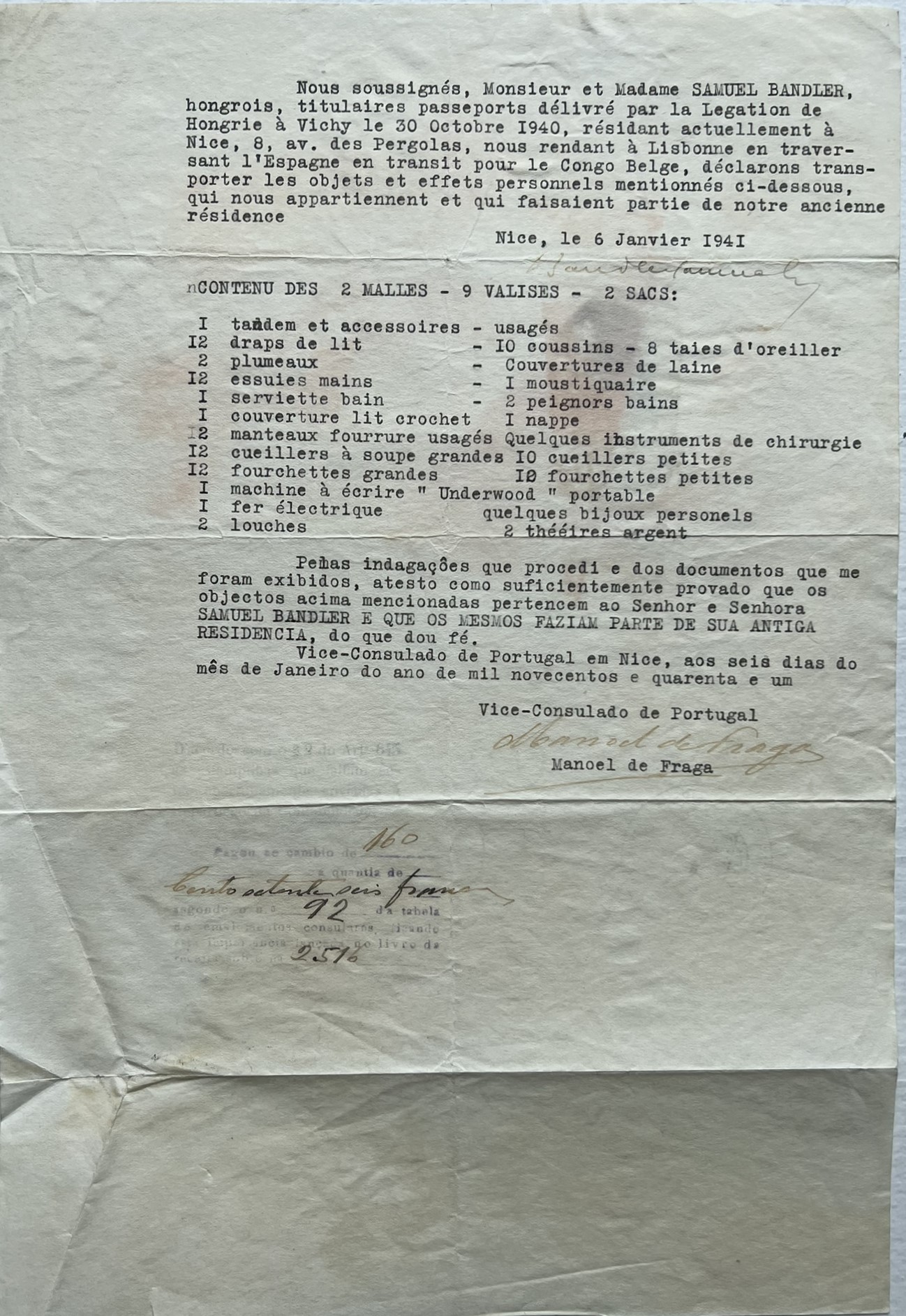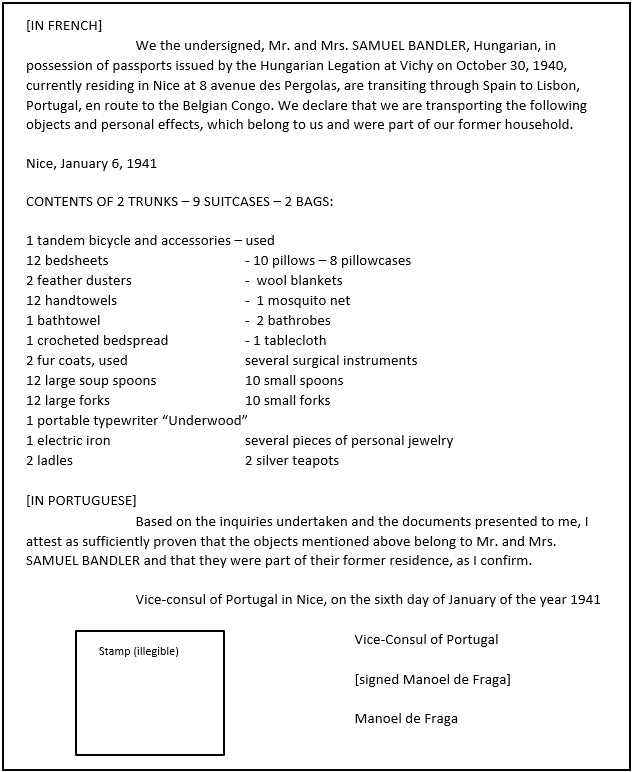 The Bandlers are able to secure documents allowing them to transit from France into Spain, en route to Lisbon, Portugal. They indicate that their ultimate destination is the Belgian Congo, although they hope to find passage to another part of the world. Having a destination outside of Europe often made it easier to obtain a transit visa, allowing entry into a country without the right to remain. Though Spanish dictator Francisco Franco is collaborating with Axis powers at this stage of World War II, Spain remains officially neutral in the conflict. Franco’s fascist regime tends to look the other way if Jewish refugees enter his country from occupied France, provided they do not stay on Spanish soil. Nonetheless, the Bandlers reside in Madrid for a time while Margit recovers from her wounds. Alexander works when and where he can in the Spanish capital, always looking over his shoulder and fearing deportation. By 1941, once Margit’s burns are somewhat healed, the family is on the move again. This time they flee to Portugal.
