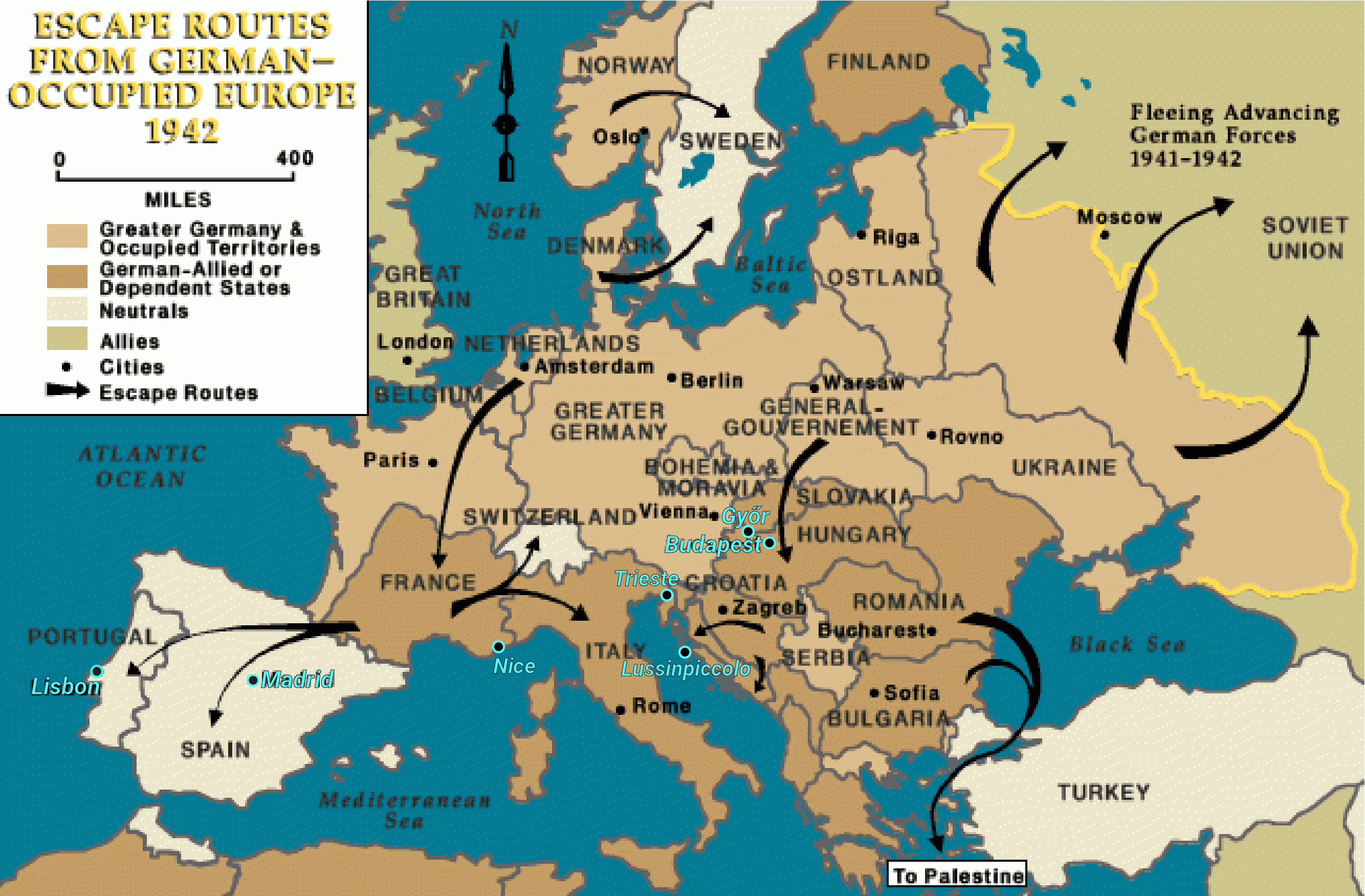 Escape routes from German-Occupied Europe, 1942. Stations of the Bandlers’ journey indicated: Lussinpiccolo, Trieste, Győr/Budapest, Nice, Madrid, Lisbon.