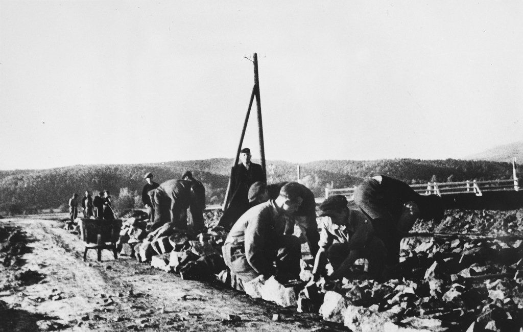 Prisoners work along a roadside at a Slovak labor camp (c. 1942 – 1944)