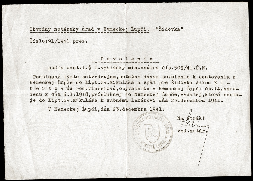 A permit for a Slovak Jewish woman to travel to a nearby town. “Židovka” means “Jewess” in Slovak. Irene’s permit might have looked similar to this one. (December 1941)