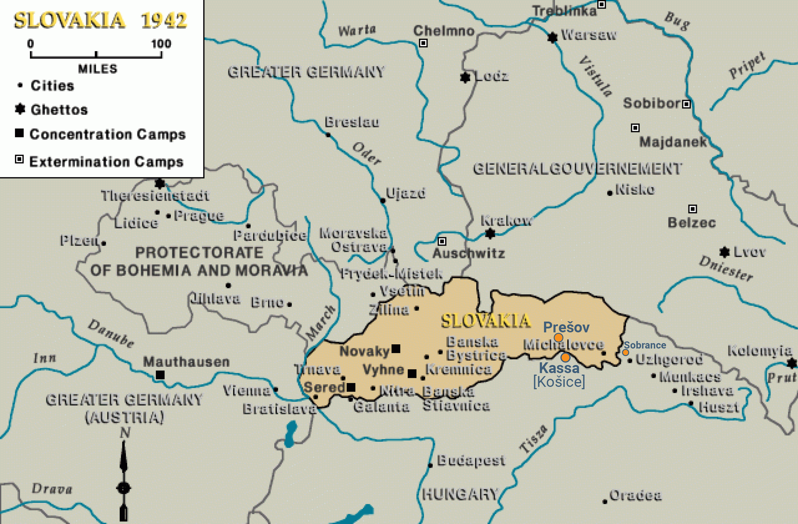 Slovakia in 1942, with labor/concentration camps Novaky, Vyhne, and Sered indicated